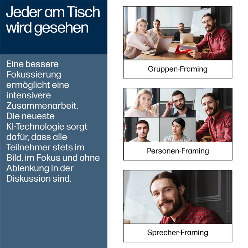 Grazie alla tecnologia intelligente della telecamera Poly DirectorAI, i partecipanti vengono automaticamente mostrati nella luce migliore. Funzioni come l'inquadratura automatica dell'oratore, l'inquadratura della persona e l'inquadratura del gruppo assicurano che la messa a fuoco sia sempre sull'oratore corrente o sull'intero gruppo. Inoltre, Poly NoiseBlockAI e Acoustic Fence riducono al minimo i rumori di fondo indesiderati, in modo che tutti i partecipanti possano essere ascoltati chiaramente.