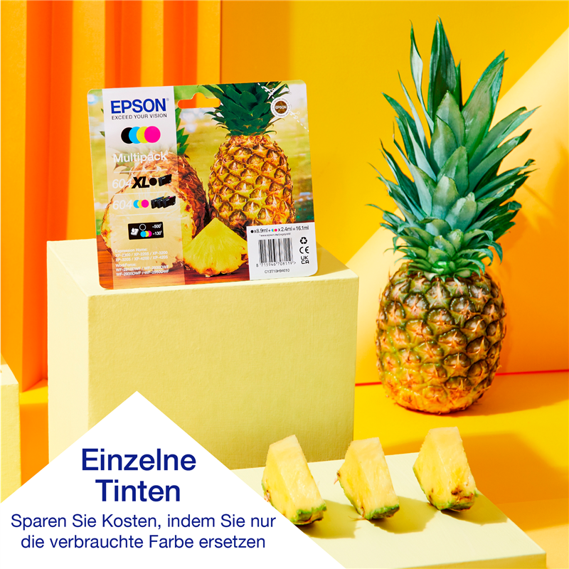 Das vierfarbige Tintenpatronenset Ananas 604 von Epson sorgt zuverlässig für klare Ausdrucke bei minimalem Aufwand. Zusätzlich zur Senkung Ihrer Druckkosten mit preiswerten Einzelpatronen in Standard- und XL-Größe.